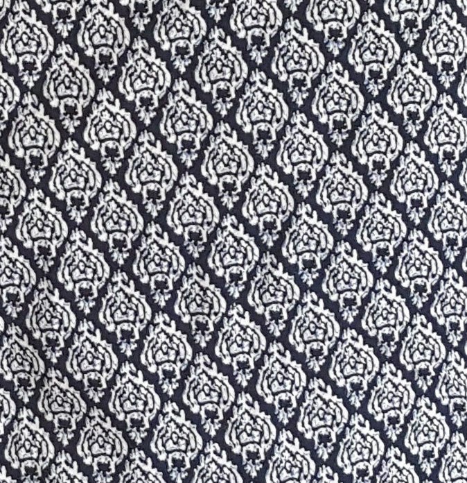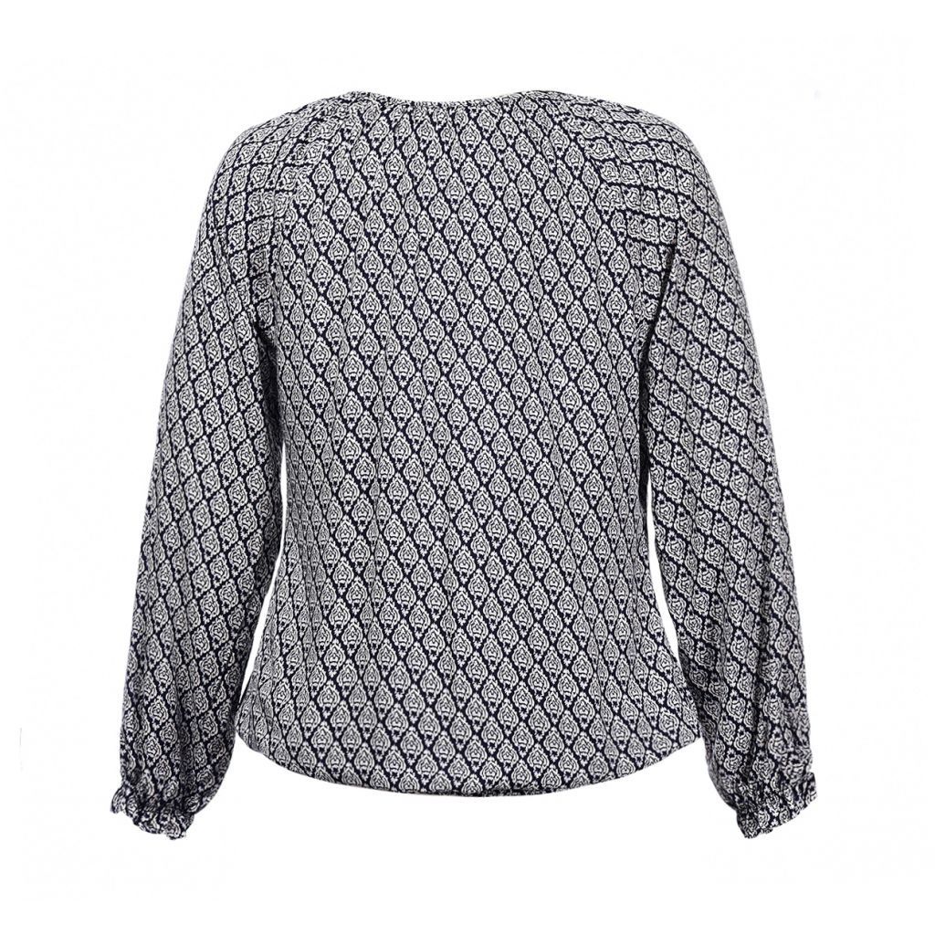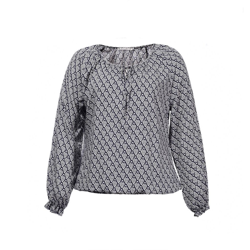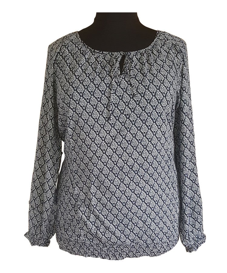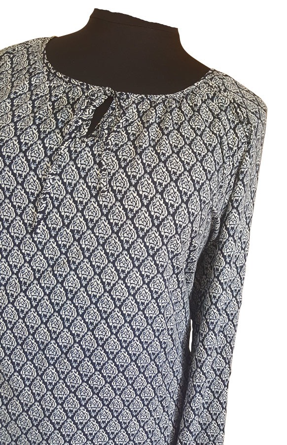 Sød bluse i mørkeblå farver, som kontrast er anvendt en off-white. Blusen er med lange ærmer med en lille elastik omkring håndleddet. Halsudskæringen er rund og med bindebånd. I midten af halsudskæringen, der hvor bindebåndene mødes, er der en lille v-udskæring.