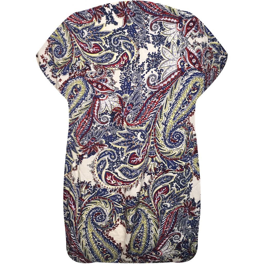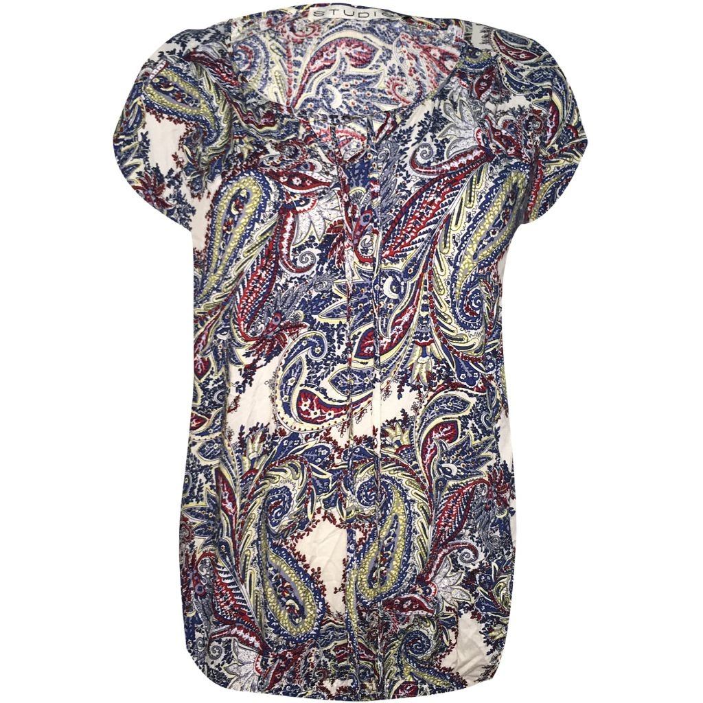 Sød bluse i et fabelagtigt print i skønne farver i en blød metervare fra Studio. Blusen er med helt korteærmer og rund udskæring. Midt på udskæringen er der et v-udsnit med bindebånd over. Nederst har blusen en bred smock kant, som man enten kan sætte på hoften eller folde rundt og give blusen en lidt poset effekt.