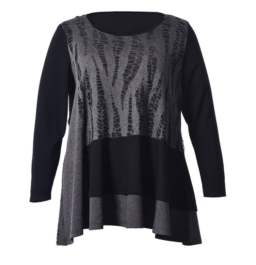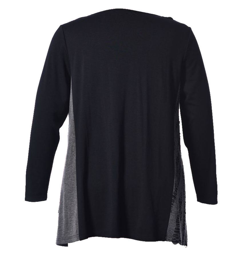 Flot bluse fra Näis med lange ærmer og rund halsudskæring. Blusen er syet i flere forskellige sorte og grå stoffer og har mange fine detaljer. Ærmerne er sorte og ryggen er primært sort, men i den ene side er der en grå stolpe, som fortsætter rundt på fronten. I den anden side er blusen også grå, men her er stoffet hullet med sort stof under.