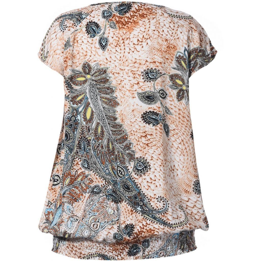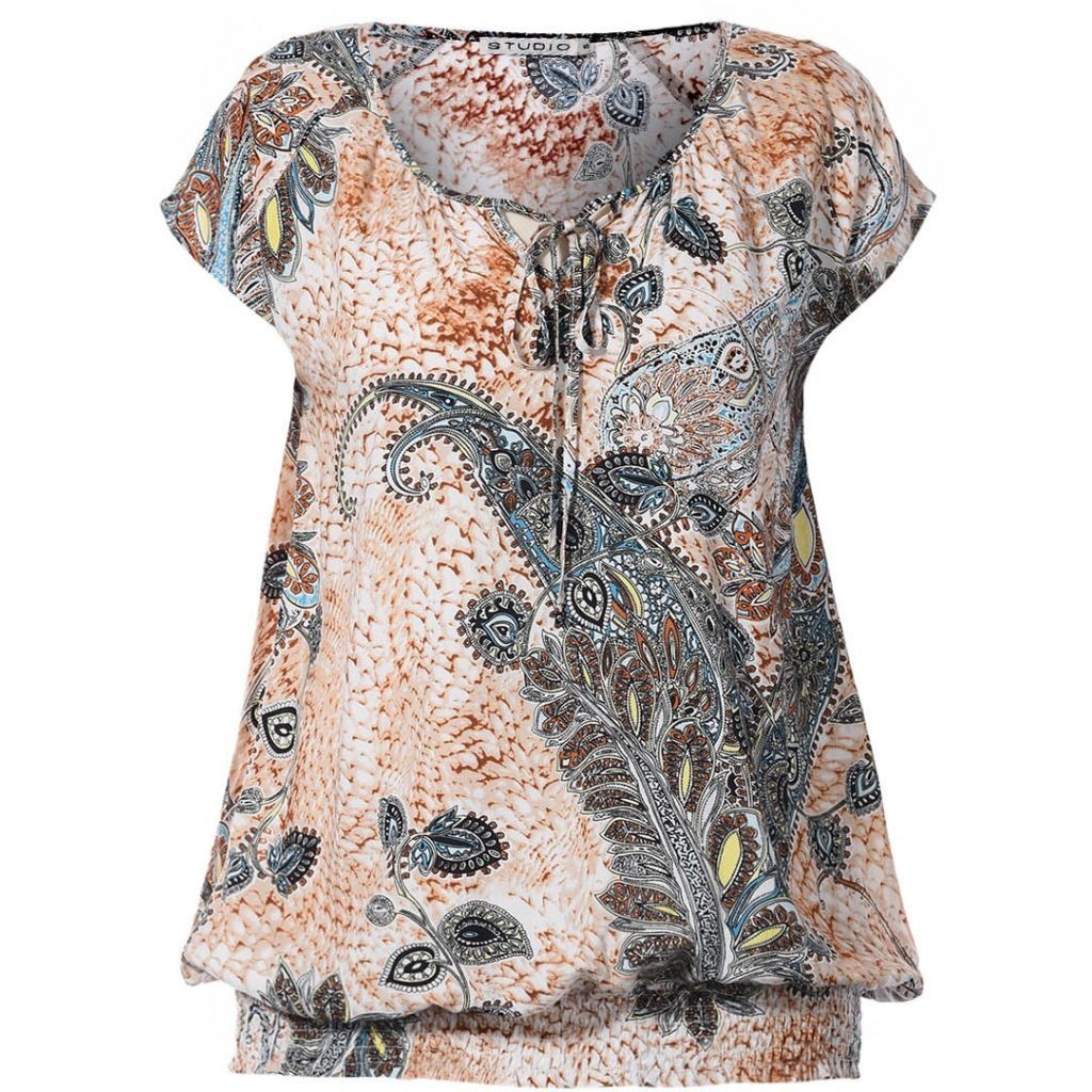 Let og lækker bluse i ren viskose. Blusen er i et flot grafisk print i friske farver og med meget korte ærmer. Blusen er med v-halsudskæring, men med et bindebånd henover, som kan bindes og give illusionen af en rund hals.