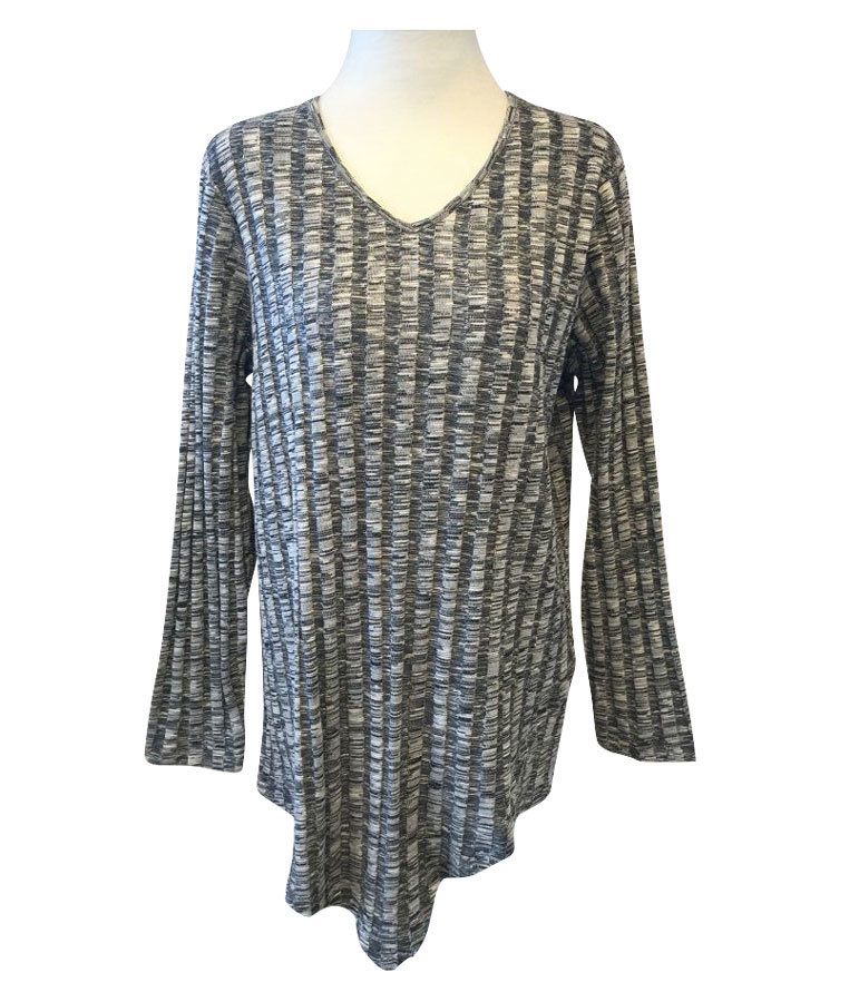 Sød bluse med lange ærmer og v-halsudskæring. Blusen er strikket i stolper, der virker slankende. Foran går blusen ned i en spids, dette giver blusen lidt kant. Blusen er Off-white / Grå melange.