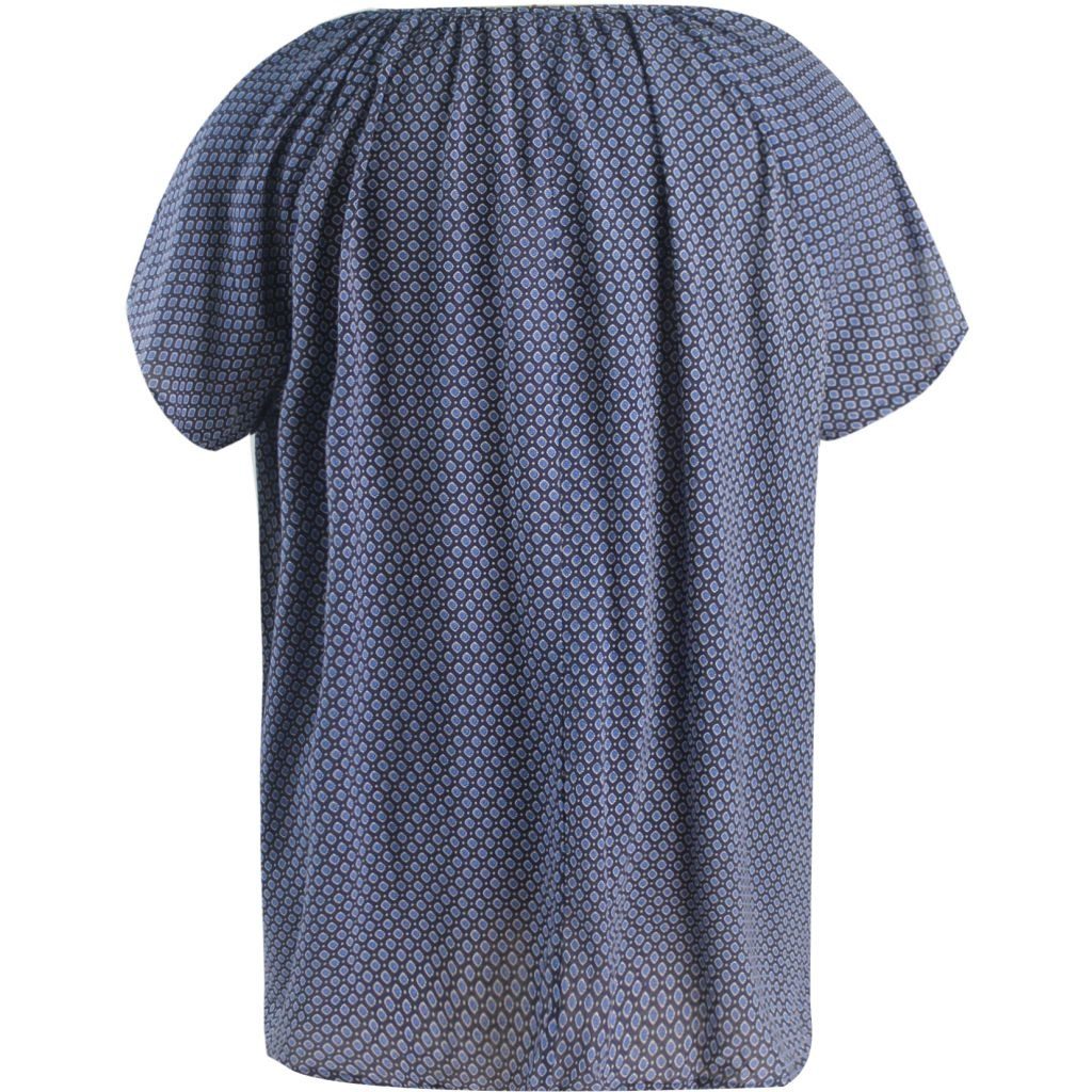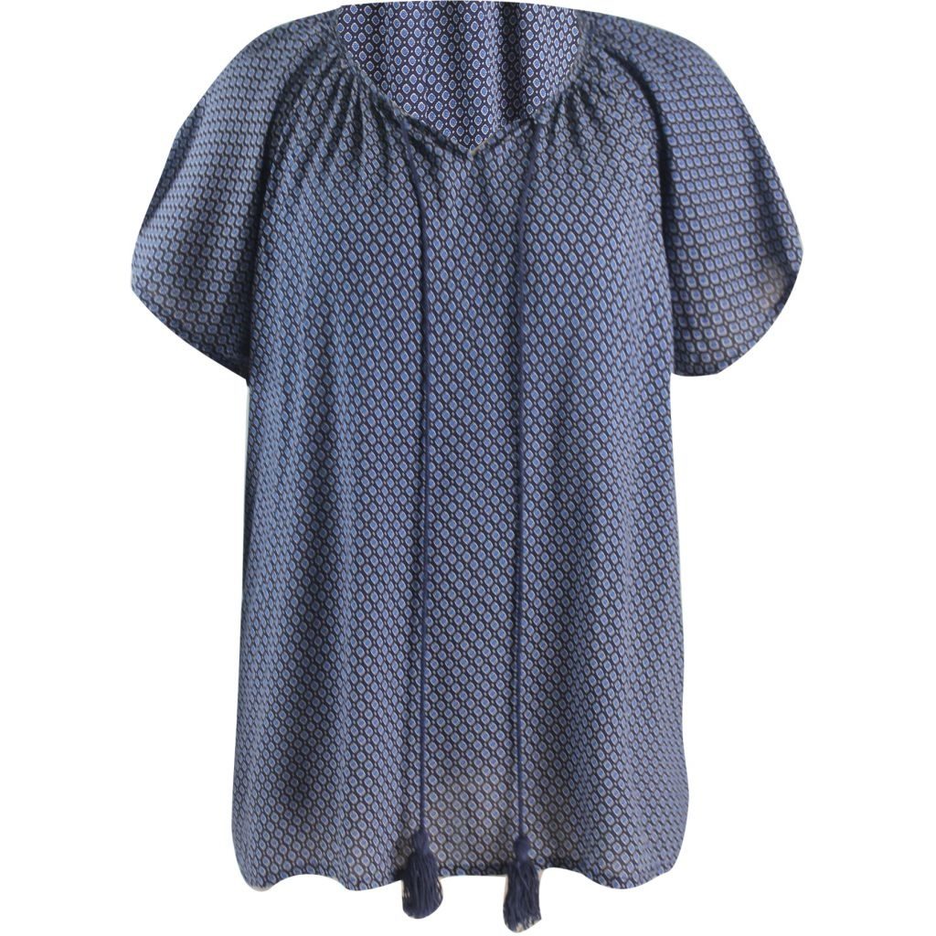 Fin og elegant bluse med et flot blåt print i et lækkert blødt stof. Blusen er med korte sommerfugle ærmer. Denne blå bluse er med rund halsudskæring, midt på udskæringen foran er der et blødt v med blå snore i rent bomuld med en kvast i enden. Du har vælge og binde båndene er blot lade dem hænge.