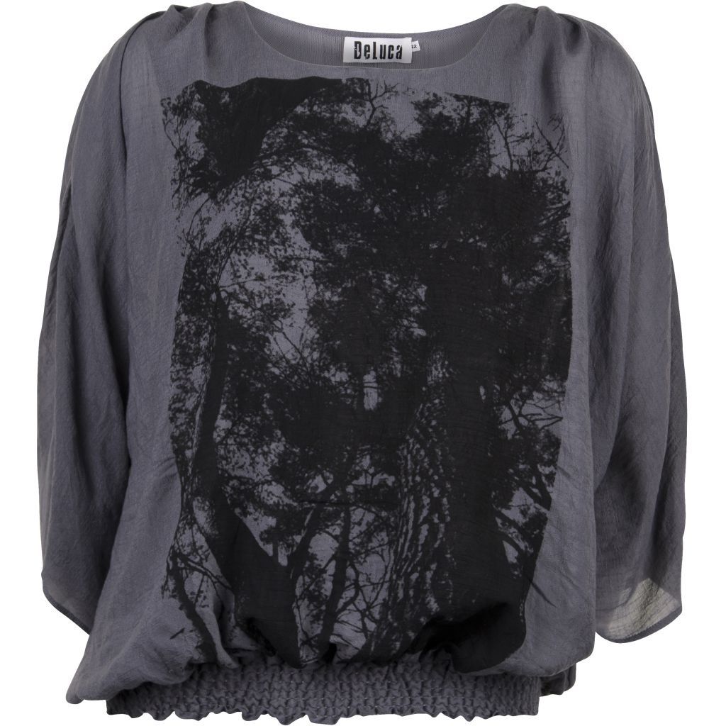 Flot grå bluse med balloneffekt og ¾ ærmer. På fronten er der et sort print med en anderledes struktur, dette giver et flot helhedsudtryk, bagpå er blusen ensfarvet.