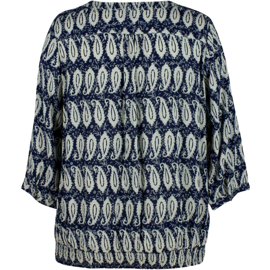 Flot blå bluse med v-hals i blad print. Blusen har mange søde detaljer fx er der over skuldrene er lille indsats med perler samt rynkebånd i stoffet. Nederst afsluttes blusen med samme rynkebånd.