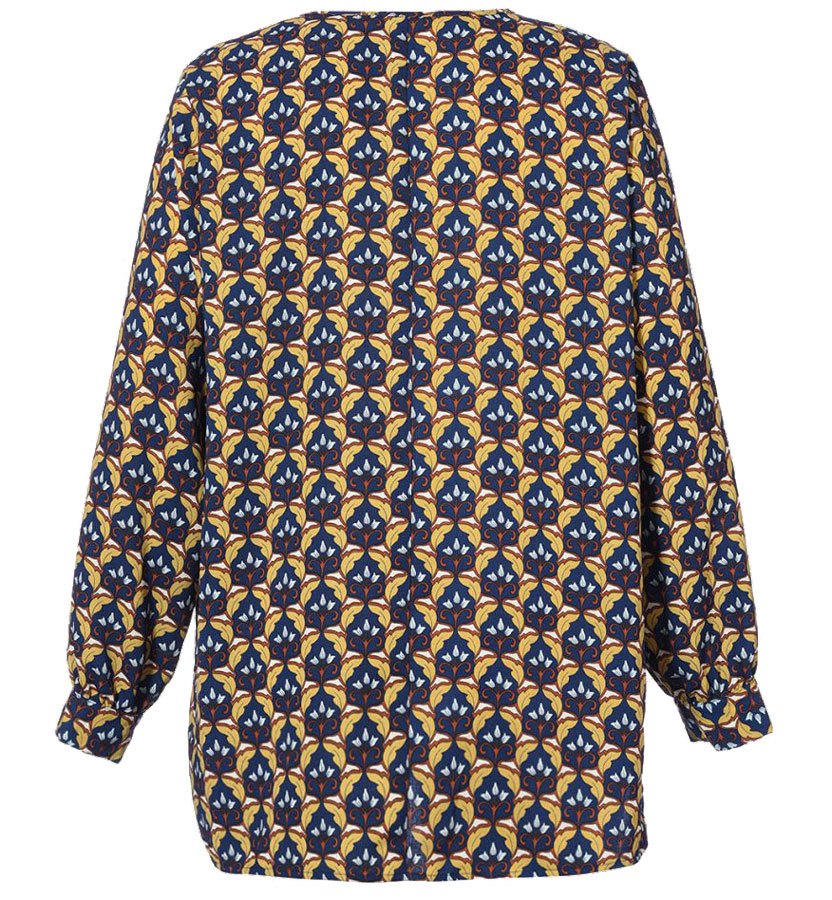 Flot bluse i en lækker metervare, der føles blød mod huden. Blusen er med v-udskæring. Henover skuldrene er der en smart detalje, med et smalt indsyet bånd. Blusen er med lange ærmer, der afsluttes med en smal indsyet elastik. Nederst er ryg-stykket lidt længere end fronten, og begge dele er skåret lige.