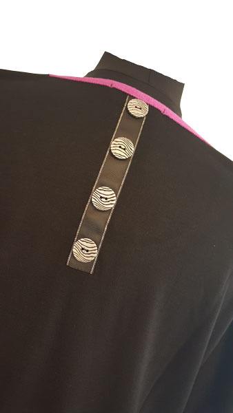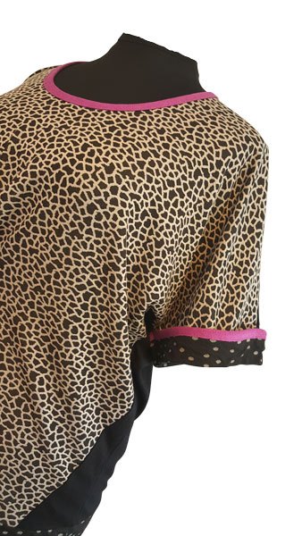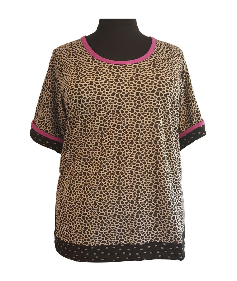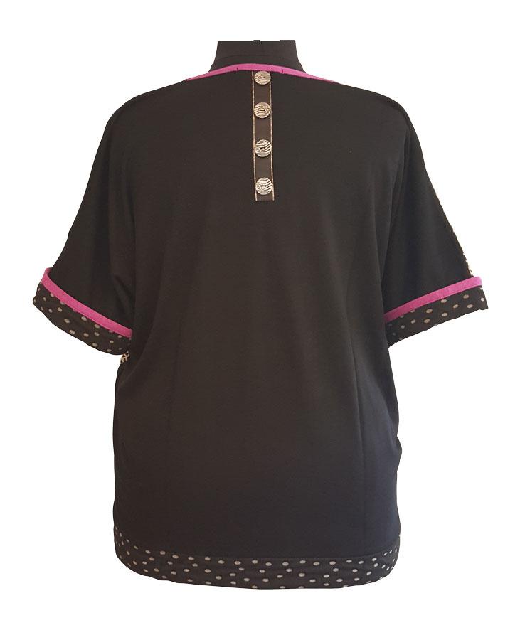 Flot bluse fra Näis by Gozzip med mange fine detaljer. Blusen er med rund hals og korte ærmer. Rundt i halsen og på ærmerne er en lys lilla bort på ca. en cm. Yderst på ærmerne og nederst på blusen er der en bredere bort i sort beige farvet mønster, der ligner små prikker. Fronten på blusen er i et sort og beige print og ryggen er sort.