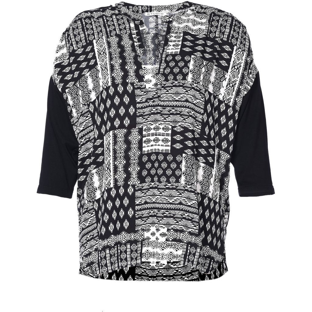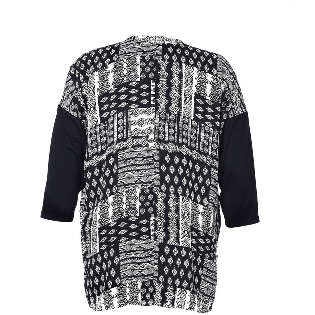 Sød skjortebluse med grafisk print i sort og hvid, mens ¾ ærmerne er helt sorte. Skjorteblusen er med kinakrave og v-udskæring.