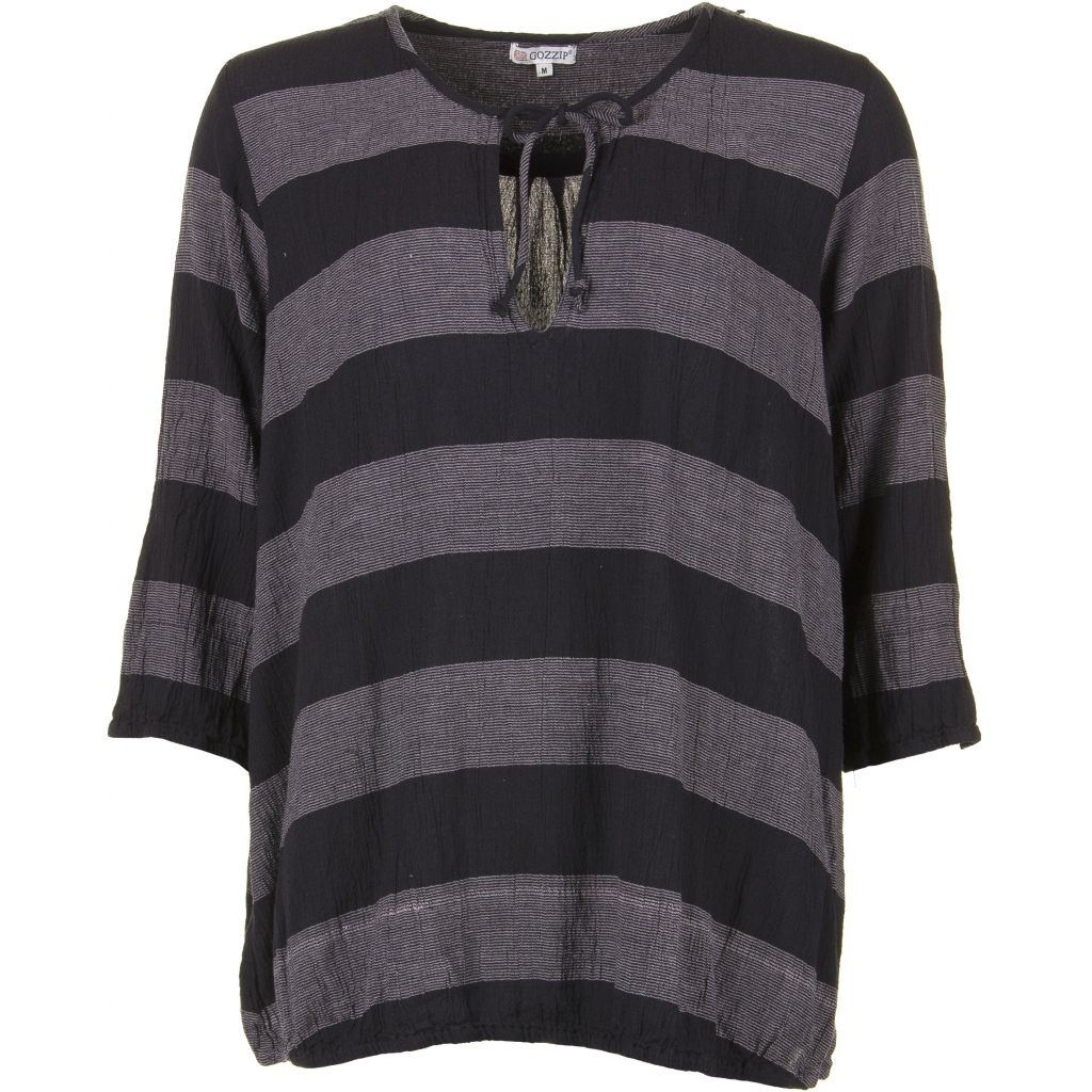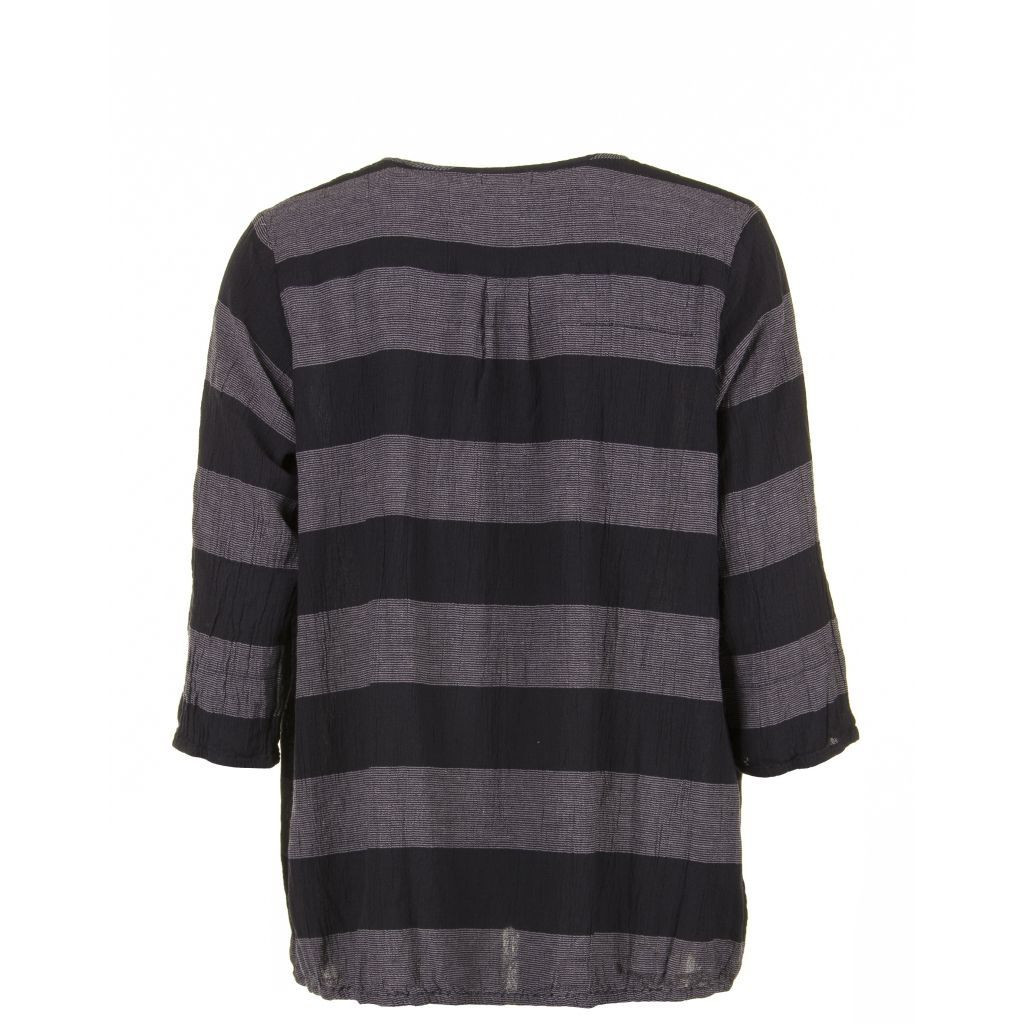 Smart bluse i brede sorte og grå striber i en virkelig lækker metervare. Blusen er med ¾ ærmer, der ligesom blusen afsluttes med en smal indsyet elastik. Blusen er med en lille v-udskæring og er med bindebånd i halsen. Blusen går ned over linningen, så du skjuler maven.