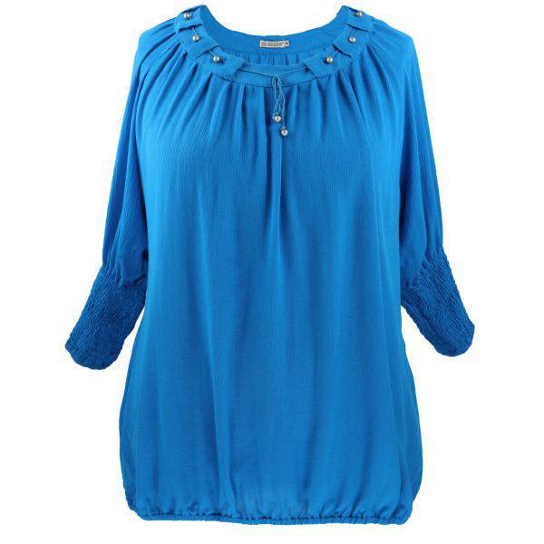 Sød Gozzip bluse i viskose crepe en i en populær metervare. Blusen er med en smal elastik forneden. Ærmerne er ¾ lange og med en bred smock nederst.
