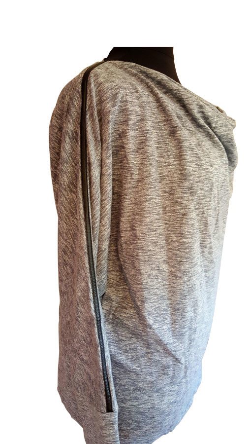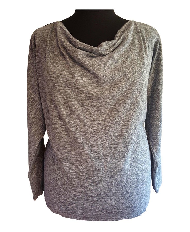Smart bluse fra Studio i grå melange. Blusen er med vandfald foran og med flagermuseærmer. Ærmerne er med en bred bort. Henover ærmerne og nakken er der en tynd sort læderstrimmel.