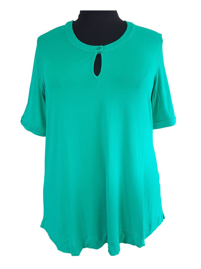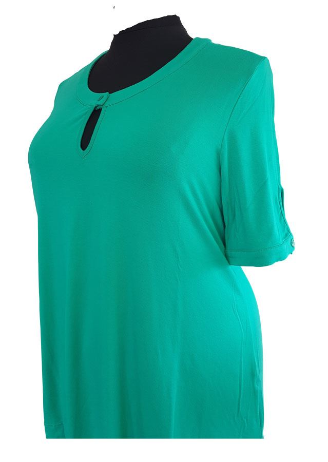 Blusen er med rund halsudskæring, der lukkes med en knap og skaber et lille nøglehul midtfor. På begge ærmer er der også et fint nøglehul der laves med en grøn knap.