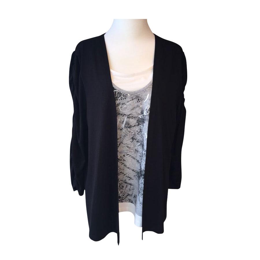 Smart twin-set bluse fra Handberg. Blusen ser ud som om, det er en lag-på-lag bluse med tilhørende cardigan, men reelt er det én bluse. Fronten er grå med print og små nitter, foroven og forneden er der en cremefarvet kant. Ærmer og ryg er lavet som en sort cardigan. Ærmerne er med indsyet elastik øverst, så de får en rynke-effekt.