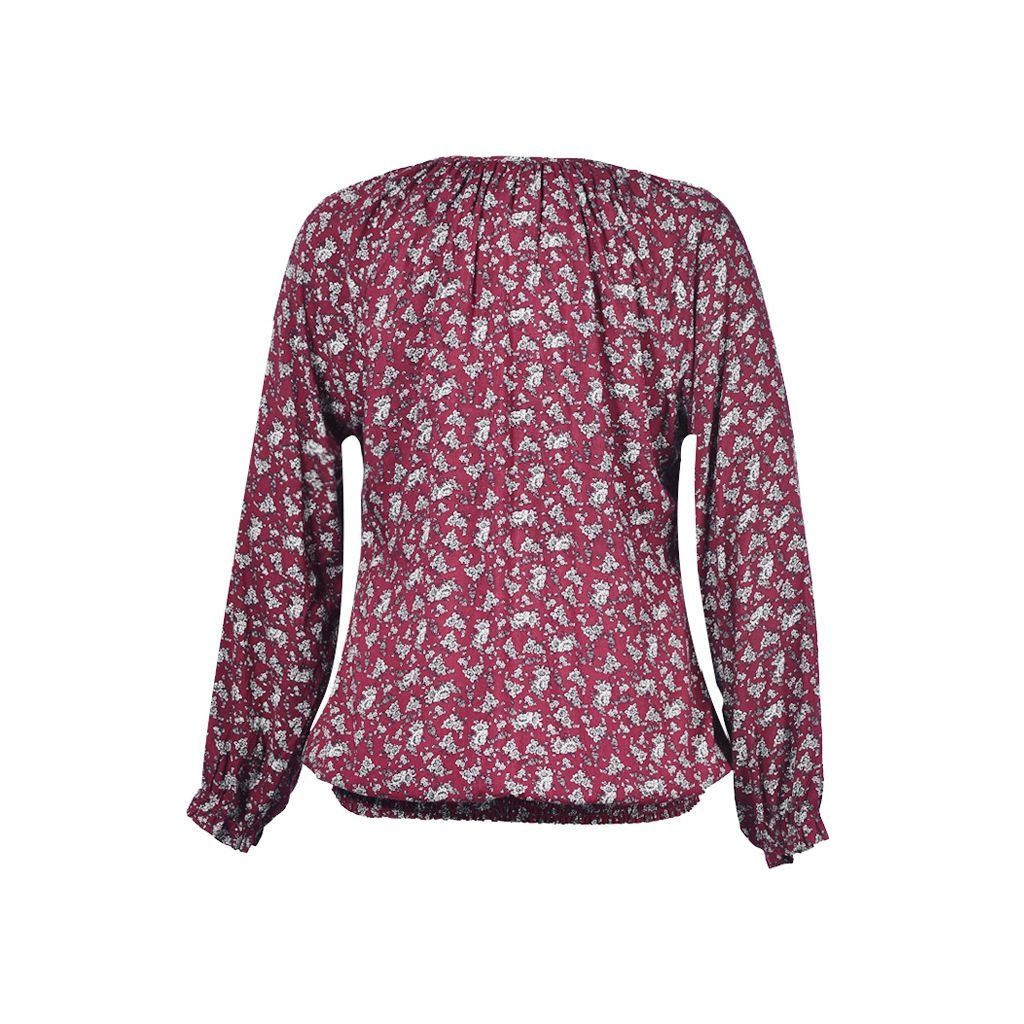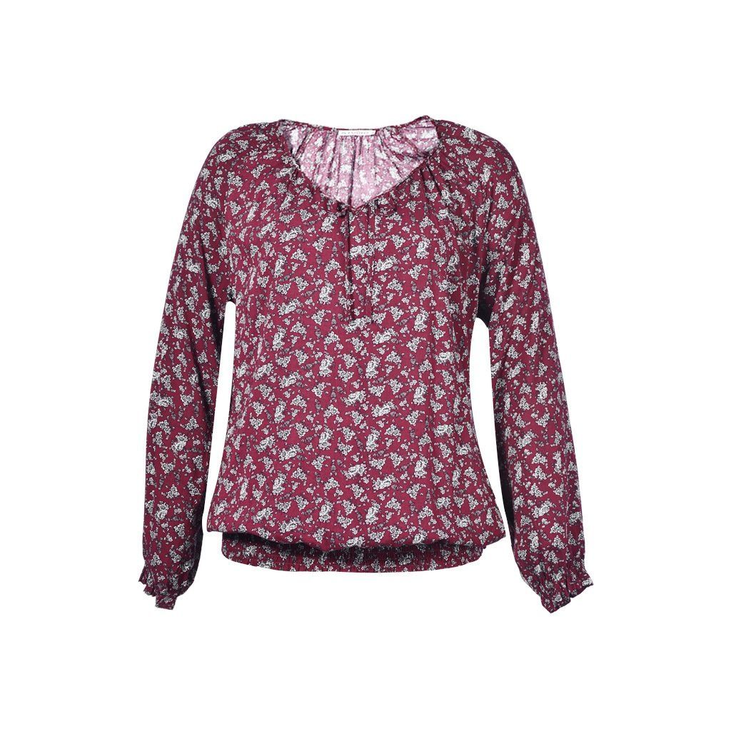 Skøn bluse i ren viskose i en let metervare. Modellen er i vinrød som grundfarve med et blomstret print i sort og hvidt. Blusen er med lange ærmer, der afsluttes med elastik. Blusen har en løs pasform, og den afsluttes med en bred smock elastik.