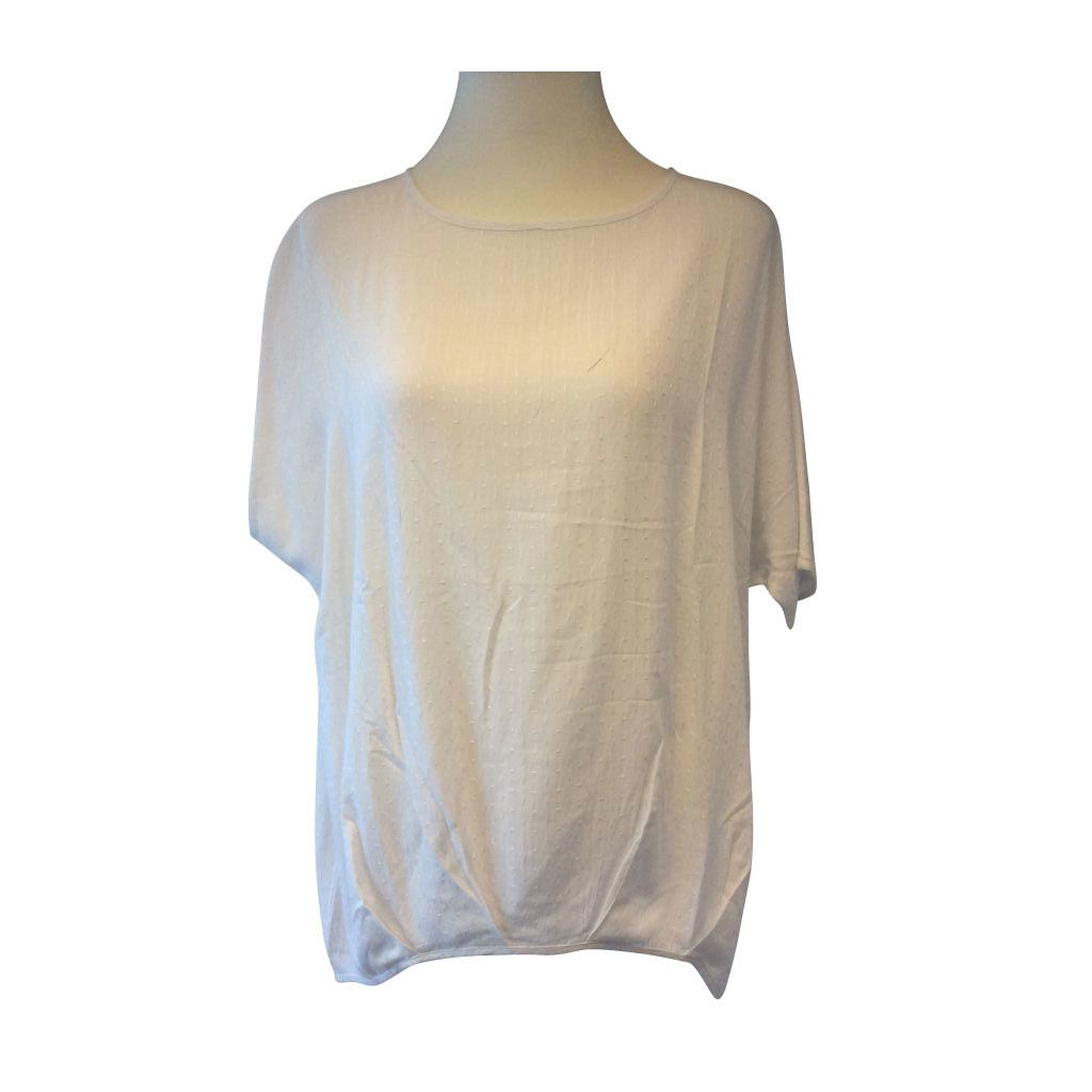 Sød lettere oversize bluse fra OneMore. Blusen er med korte ærmer, og der er dryp i begge sider forneden. Stoffet er en meget blød hvid viskose med hvide nister. Blusen er med rund halsudskæring. Øverst på ryggen er der en lille lynlås, ryggen er lidt længere end fronten.
