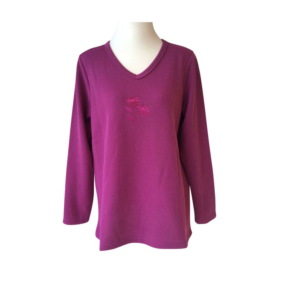 Pæn bluse i en lækker kvalitet fra Handberg. Blusen er med lange ærmer og V-hals. På fronten er der en lille syning i samme farve som stoffet af to blomster. Syningen bryder stoffet foran og giver en god effekt.