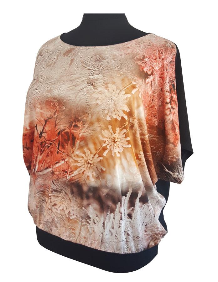 Ryggen på blusen er sort og det er borten ved halsudskæringen også. Fronten på blusen er med grafisk print. Blusen findes med grøn front, hvor mønstret er store grønne roser på en sort baggrund. Derudover findes blusen med en front i stærk koral, her er mønstret mere abstrakt.