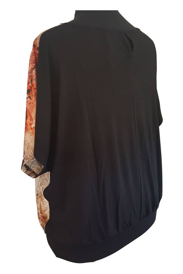 Sød bluse med korte ærmer med let flagermus effekt. Nederst har blusen en bred sort bort, der giver blusen en lidt poset effekt. Halsudskæringen er rund og bagpå er der et lille nøglehul.