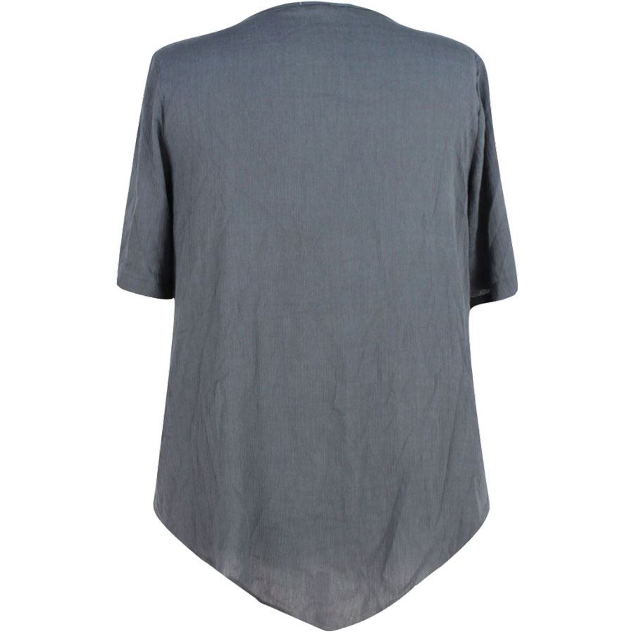Flot asymmetrisk bluse fra Gozzip i lækker crepe. Blusen er med korte ærmer og v-hals. Foran og bagpå slutter blusen i en spids. På fronten er der broderi og print i forskellige farver. Dette er et frisk pust over et par cowboybukser eller leggins.
