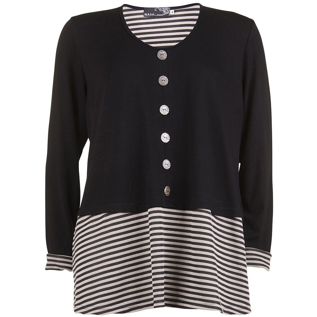 Blusen ser ud som om den er todelt, men det snyder. Kraven samt nederst på blusen er i sort og sand farvede striber, mens resten er sort. Ærmerne kan rulles op, så de også har striber eller man kan få ekstra længde på ærmerne ved bare at lade dem hænge. På fronten ligner det sorte en cardigan med knapper og syninger i midten.