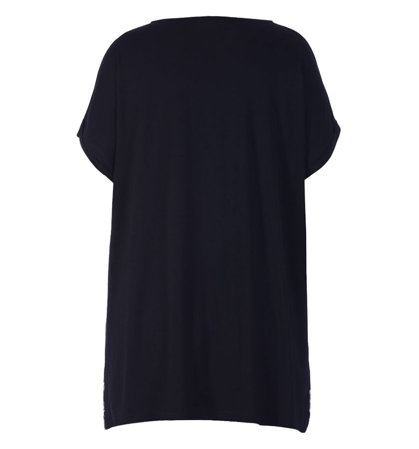 Sød bluse med korte ærmer i en lækker navyblå viskose med blomstret print. Printet er i rosa, brune og hvide farver. Blusen er med rund halsudskæring. Bagstykket er sort og for at skabe en flot sammenhæng mellem den sorte ryg og den navyblå front, så har de korte ærmer en lille sort fold.