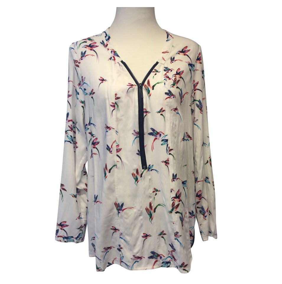 Super smart bluse fra OneMore i off-white med et funky fugleprint. Blusen har Kinakrave med en sort lynlås foran. Nederst på de lange ærmer er der indsat en sort bort med tre knapper, så man kan have ærmet hængende løst, opsmøget eller knappet. Blusen er syet i baner foran og bagpå for at bryde de store flader.