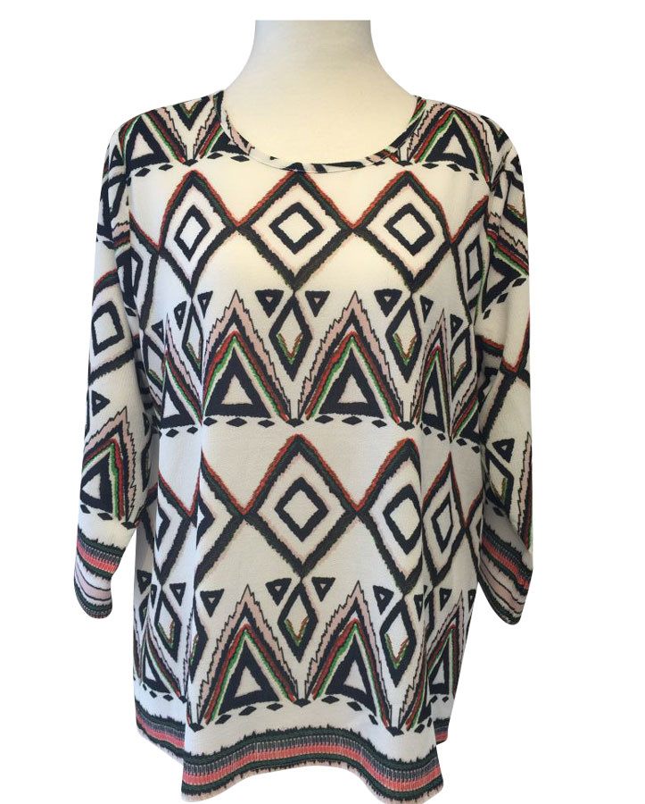 Smart off white bluse med et front grafisk print i sort, grøn og rød. Blusen er i en dejlig blød metervare. Blusen er med ¾ ærmer og nederst på både front og ryg runder blusen let. Blusen er med rund halsudskæring foran. Bagpå lukkes halsen med en lille sort knap, så der er nøglehuls-effekt.