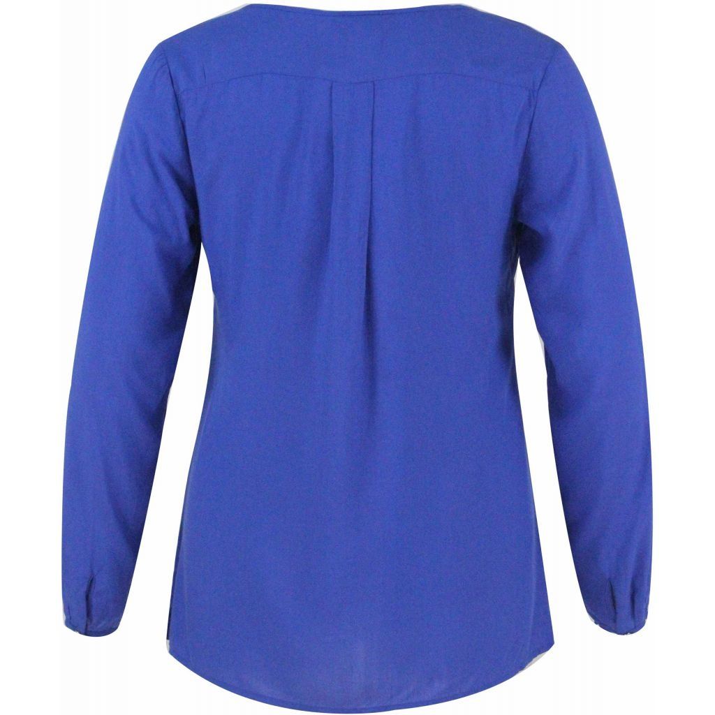 Lækker skjortebluse i en smart blå. Skjorteblusen er med lynlås halvvejs ned af fronten og med lynlåslommer foran. En flot nyfortolkning af den klassiske skjortebluse. Skjorteblusen er med lange ærmer, der kan lukkes med en knap, men du kan også vælge at rulle ærmerne og til ¾ længde og lukke dem med det indsyede bånd og knappen på skjorten. Styles flot med både leggins og bukser.