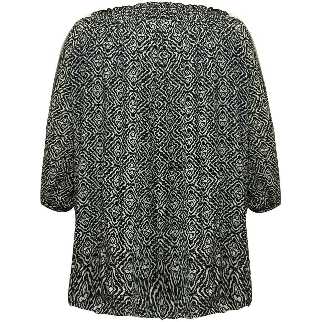 Sød og feminin oversize bluse i et fantastisk blåt og hvidt print i en lækker metervare i 100% viskose. Blusen er med ¾ ærmer, der afsluttes med en tynd indsyet elastik. Rundt ved halsen har blusen en bred smock elastik, der enten kan sidde løst, eller som kan trækkes ned over den ene eller begge skuldre. Lige under smocken er der syet små folder i stoffet, som gør at blusen falder flot, uanset hvordan den sidder. Nederst afsluttes blusen med et bindebånd, der er syet ind i blusens bort. I hver ende af bindebåndene er der små ”sølv-hætter.”