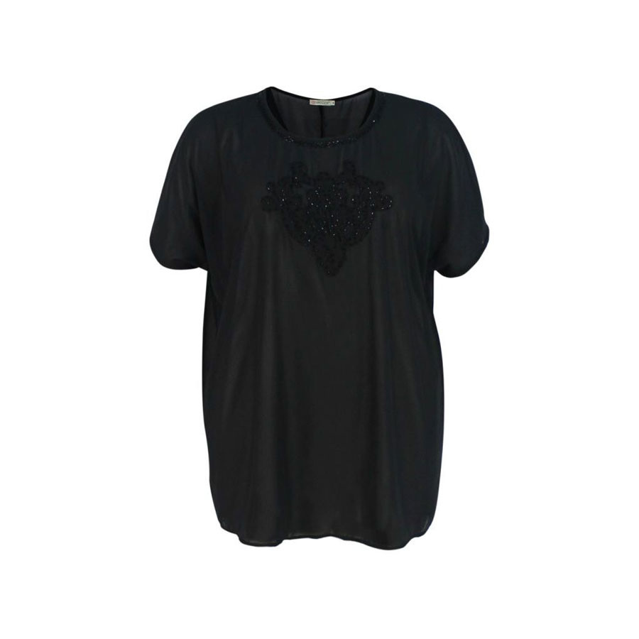 Smart sort bluse med korte ærmer. Blusen er med rund hals, rundt i halsen er en smal bort af sorte perler. Henover brystet er der et mønster med samme slags sorte perler. Dette frisker blusen op.