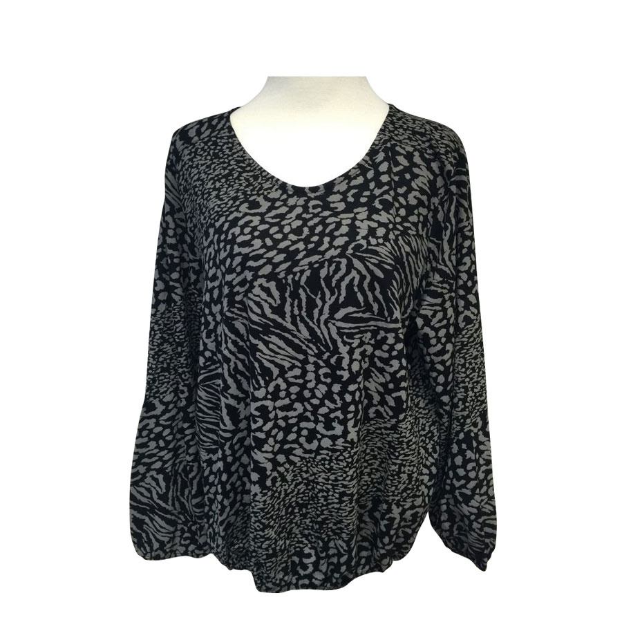 Sød sort bluse med et grafisk print i grå. Printet er lavet på forskelligvis, så det ser ud som om blusen er lavet i asymmetriske paneler.