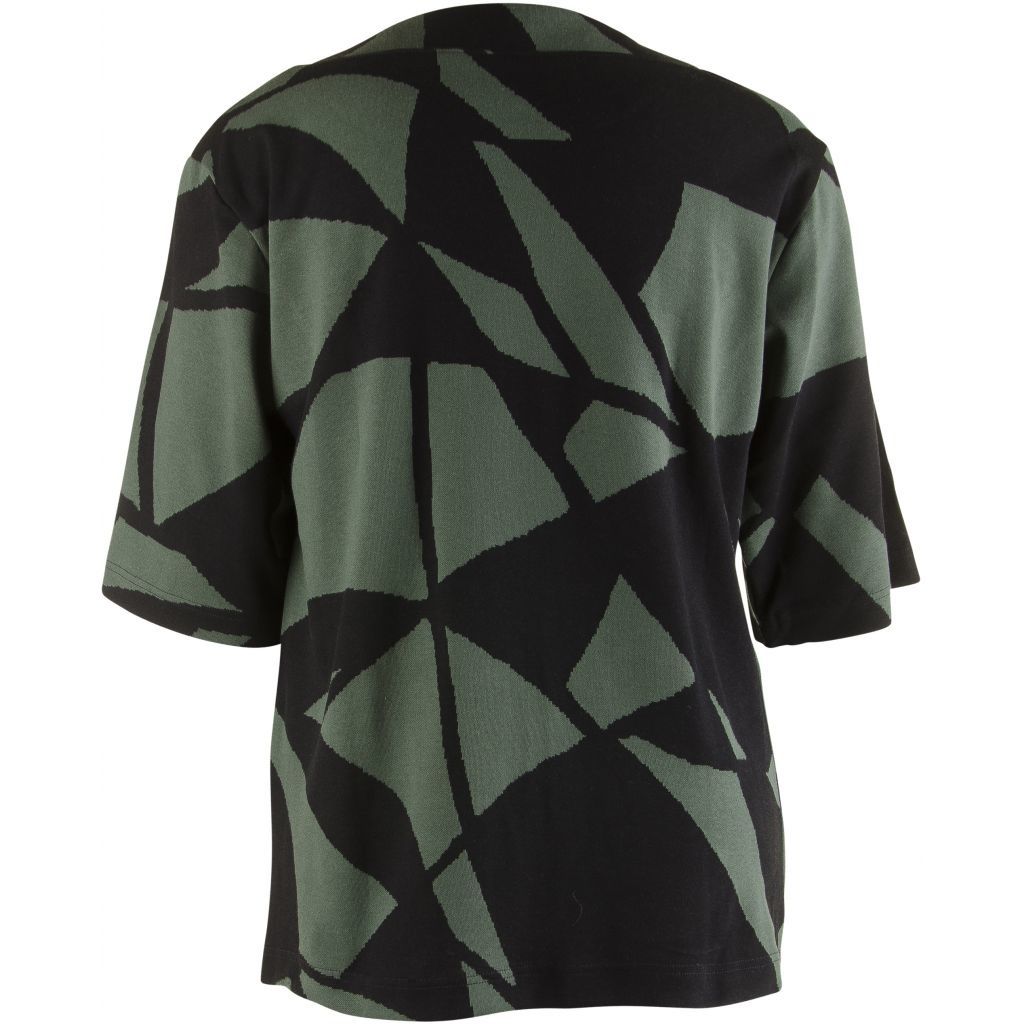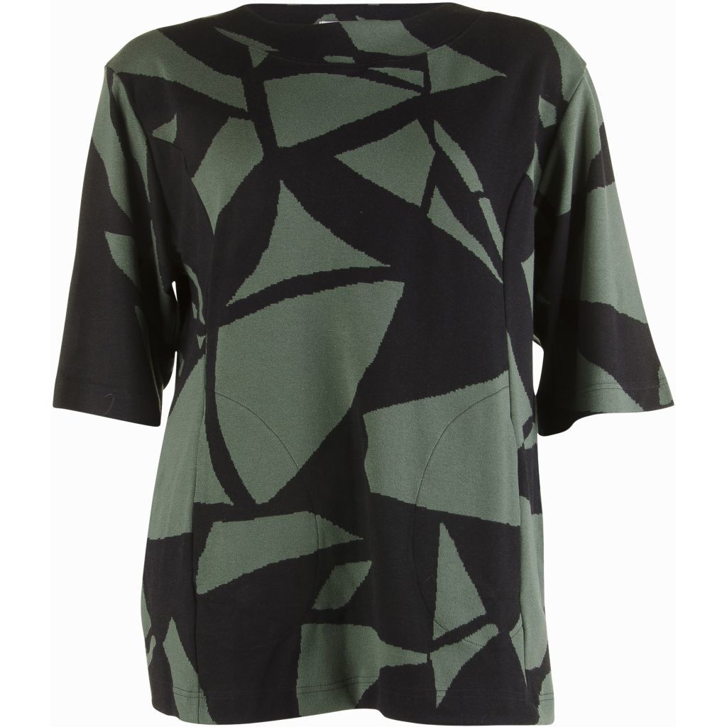 Flot bluse med korte ærmer i en flot grafisk mønstret metervare. Modellen har en rund halsudskæring med en pæn bred kant. På forstykket er der to lommer, en i hver side, der er syet ind som en halvcirkel.