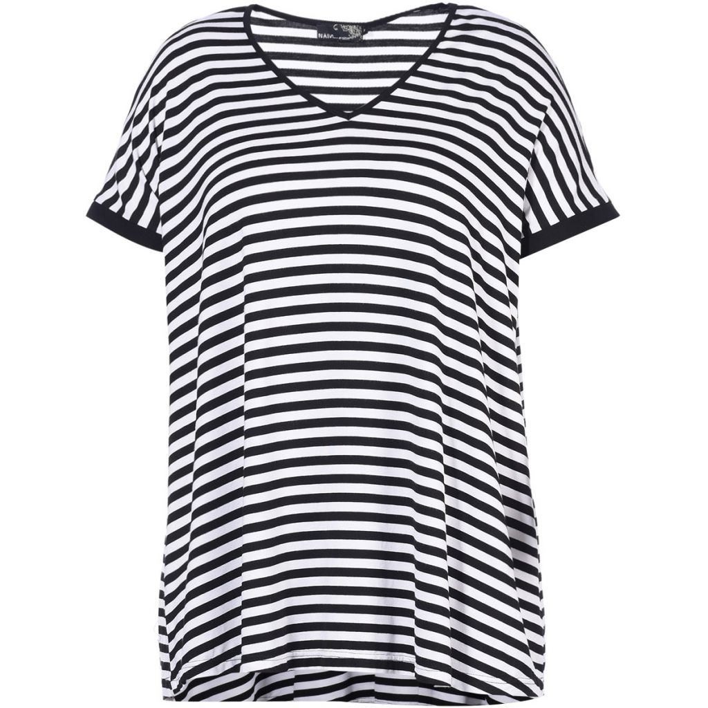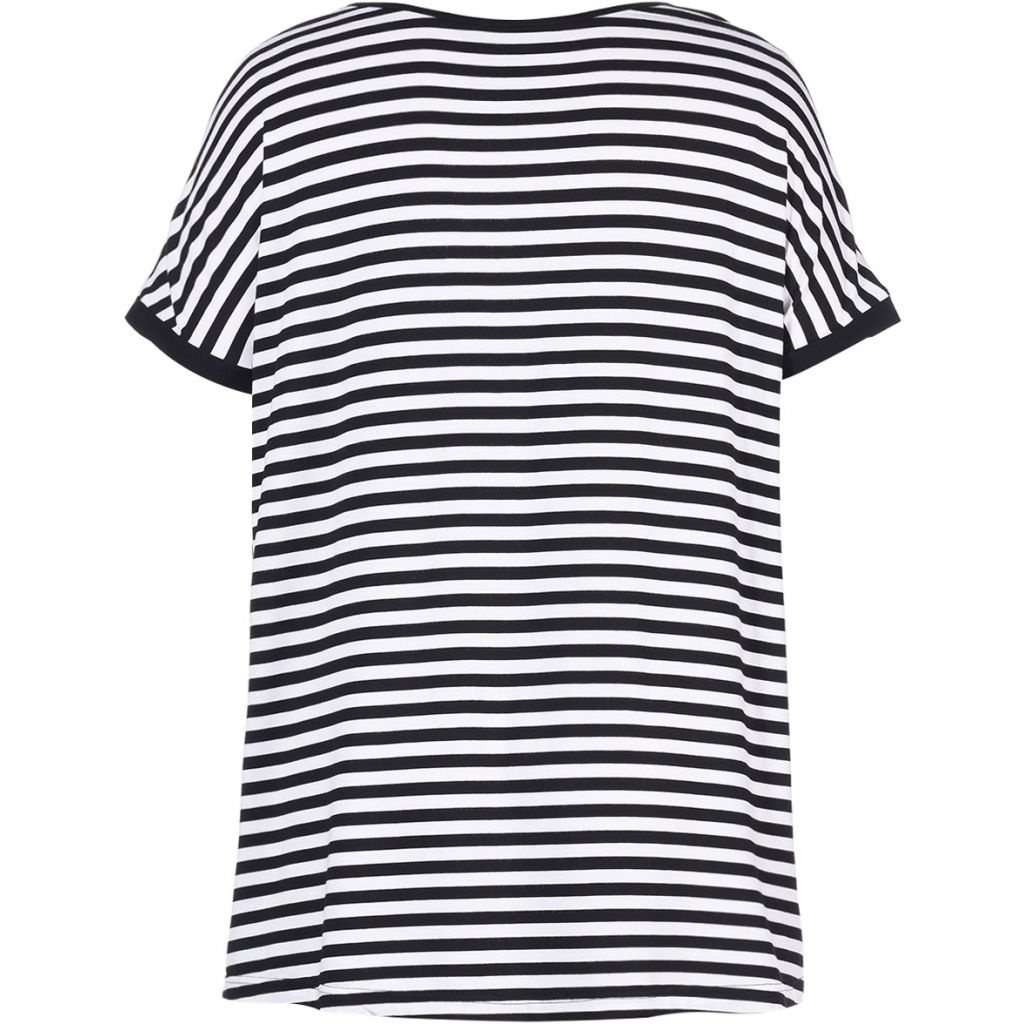 Sød sort og hvid stribet bluse med korte ærmer. Blusen er med en lille v-udskæring, der afsluttes med en tynd sort bort. Den sorte bort går igen i ærmerne. Blusen er med vandrette striber og er syet i en flot A-facon.
