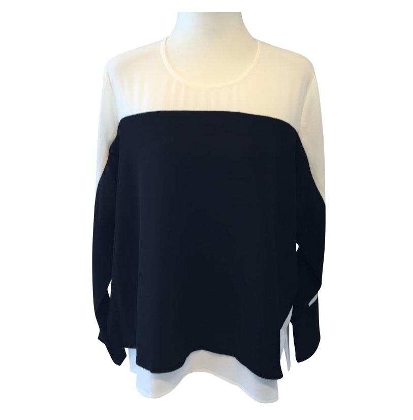Lækker skjortebluse i en meget behagelig metervare med lange ærmer. Skjorteblusen er lavet i to stoffer sort og hvid. Den inderste del af blusen og den øverste del af ærmerne er hvid, mens den nederst del af ærmerne og det løse stof hen over front og ryg er sort.