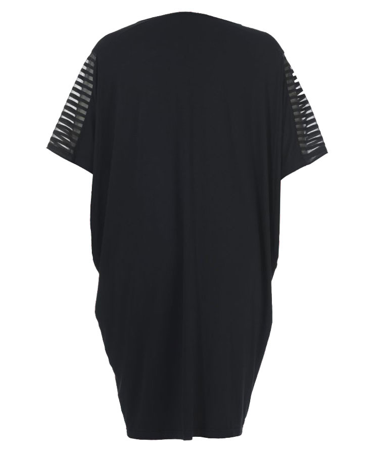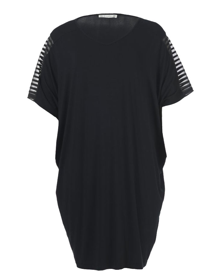 Lækker sort oversize tunika fra Studio med v-udskæring. Tunikaen er rummelig og har smarte flagemusærmer med stribet effekt over skulderen. Overdelen på ærmerne er lavet i en stribet chiffon, som skiftevis er sort og gennemsigtigt. Det bryder det sorte og gør tunikaen interessant for øjnene. Flot til både hverdag og fest.