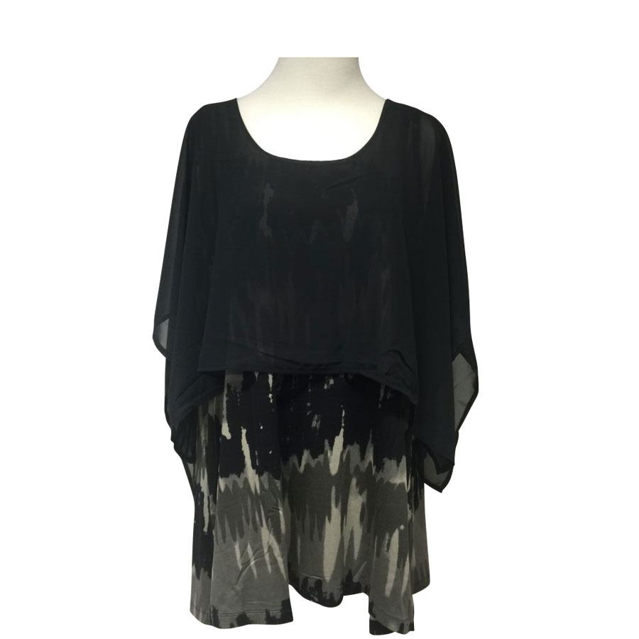 Sød todelt bluse, hvor delene er syet sammen. Blusen består af en top med brede stropper i et støvet grønt print, og en overdel i et sort gennemsigtig stof der stopper midt på maven. Dette har en kamuflerende effekt for maven.