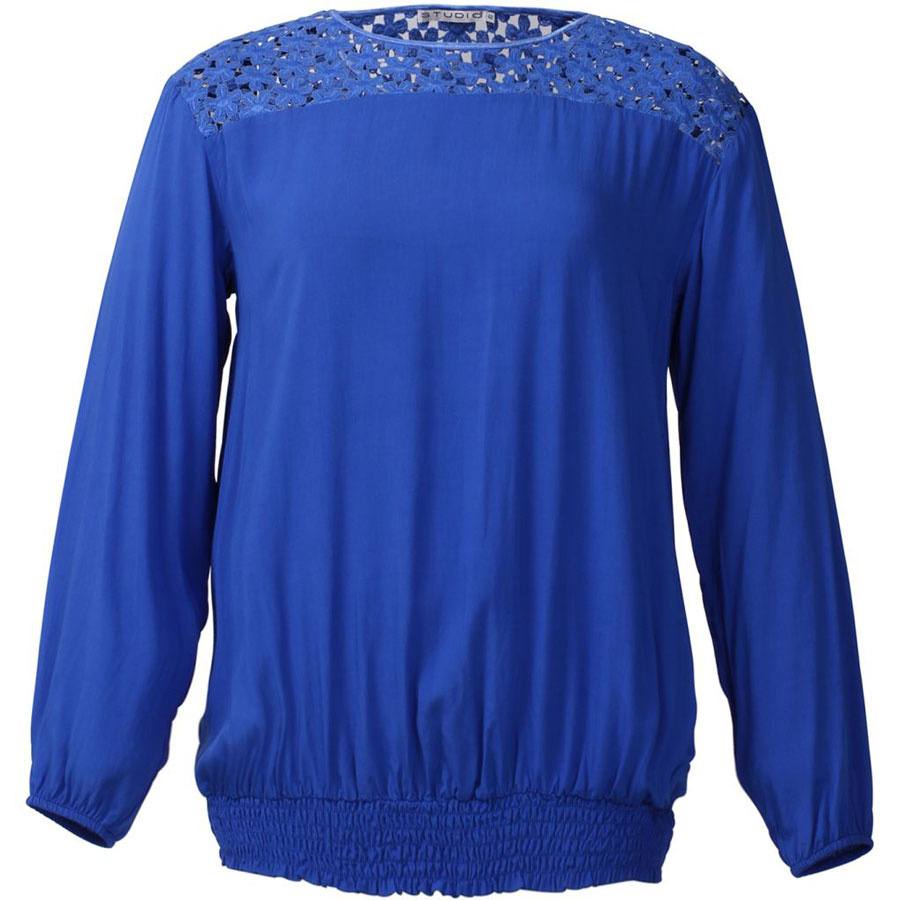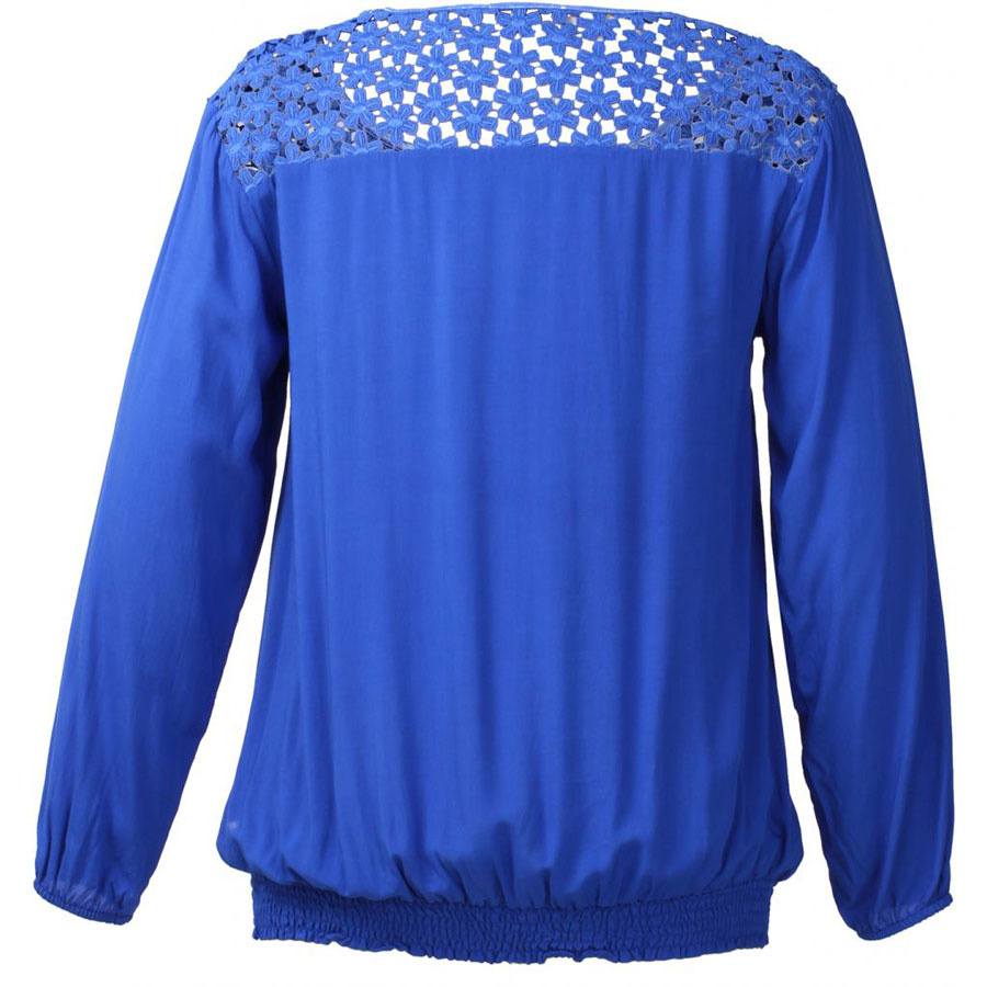 Smart koboltblå bluse med lange ærmer. Ærmerne afsluttes med en indsyet elastik. Denne super bløde bluse er med blonde henover skuldrene både foran og bagpå.