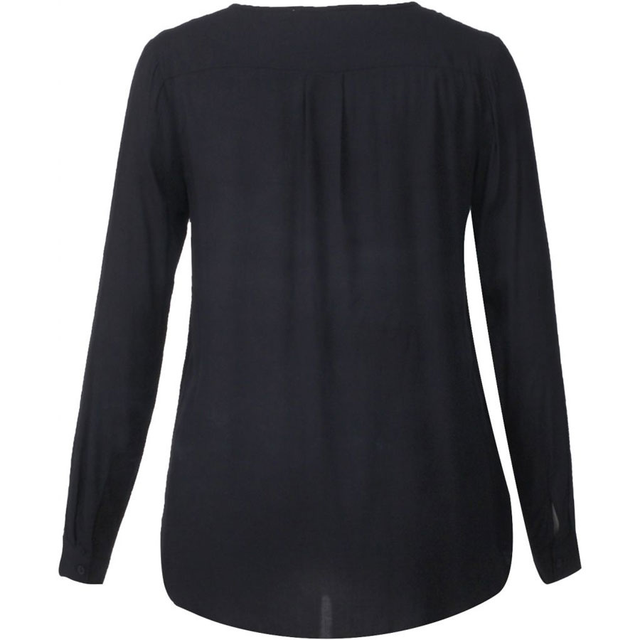 Flot, elegant og feminin sort skjortebluse med lange skjorteærmer med manchet og knap. Ved manchetten og bagpå er der læg, som giver blusen et ekstra feminint pift.