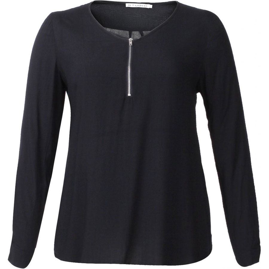 Skjorteblusen er med lynlås detaljer foran ved halsudskæringen, hvor en klassisk skjortebluse ville have knapper. Skjorteblusen sidder løst og kan bruges til både nederdel og bukser.