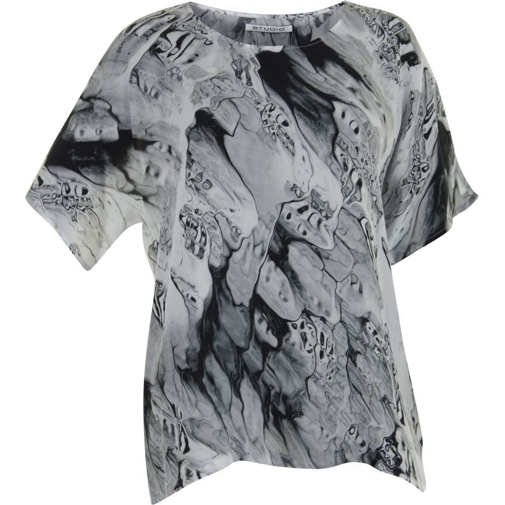 Super flot bluse i grafisk print med korte ærmer. Blusen er med rund hals. Det grafisk print går fra hvid og over i grå, sorte nuancer.