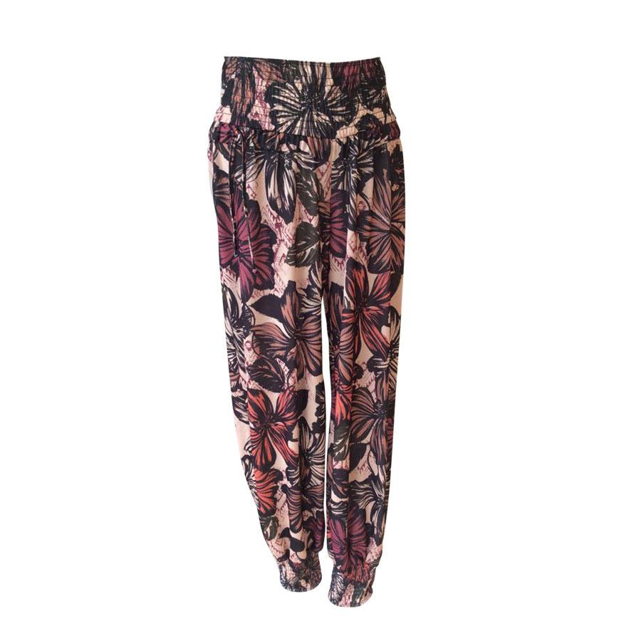 Blomstret haremsbuks med klassisk bred smockelastik nederst på buksen og i linningen. I linningen kan man justere, hvor stramt bukserne skal sidde med et bindebånd i siden.