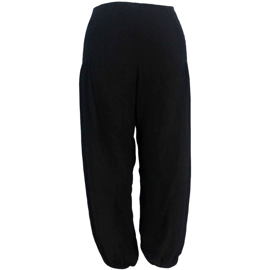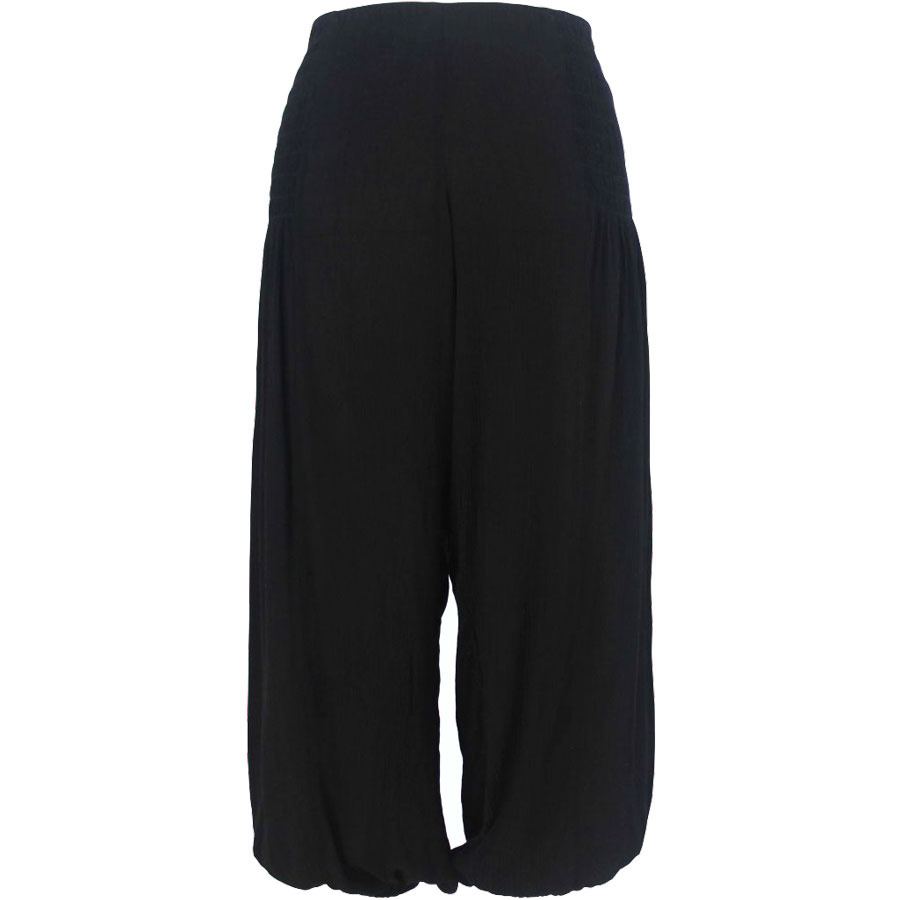 Bløde og lækre bukser i crepestof med meget vidde. Nederst på benene er der en smal indsyet elastik, og i taljen er der i begge sider lavet smock, så du er sikker på, at dine bukser sidder pænt og bliver der, selvom de sidder løst.