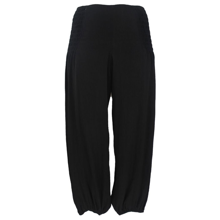 Smarte, sorte haremsbukser i lettere draperet stof. Bukserne er lange og de løse ben afsluttes med en løs elastik. I taljen er der et bredt stykke elastik i begge sider, som sikrer, at bukserne sidder tæt og holdes på plads.