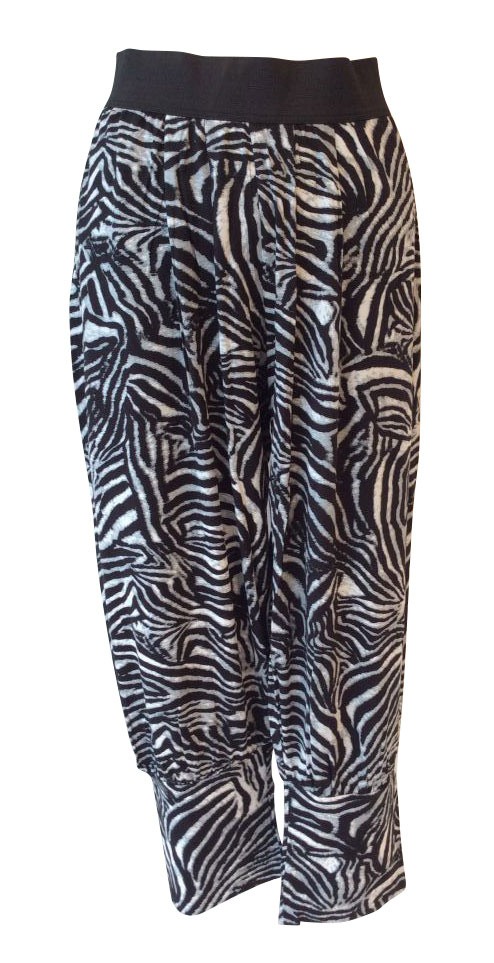 Lækker, blød Haremsbuks fra Handberg i råt sort og hvidt dyreprint. Bukserne har en bred elastik i linningen med små læg hele vejen rundt. Bukserne har god vidde omkring hofterne, hvor der også sidder to praktiske lommer. Bukserne afsluttes med en bred manchet midt på underbenet.