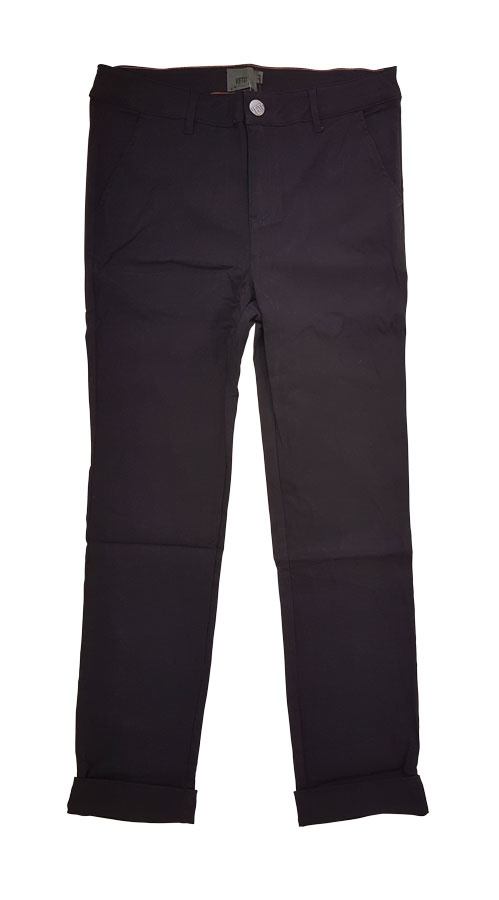 Lækker stretch buks fra Veto i en klassisk model. Benene er i 7/8 længde med en lille fold og slids ved anklen. I linningen er der bæltestropper, og buksen lukkes med en knap og lynlås.