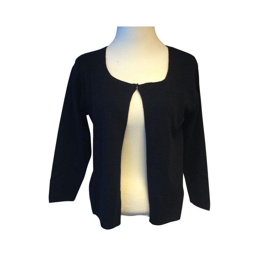 Sød navy kort cardigan i en tynd strik med ¾ ærmer. Cardiganen kan lukkes med en enkelt hægte, men kan også stå åben. Nederst på ærmerne og på cadiganen er der en smal rib på ca. 1,5 cm.