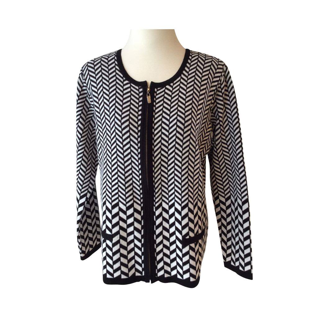 Flot strikket cardigan eller jakke i sort og hvidt sildebensmønster. Cardiganen er meget elegant med sorte kanter på ærmerne sorte stolper på hver side af lynlåsen og sort kant rundt i halsudskæringen.