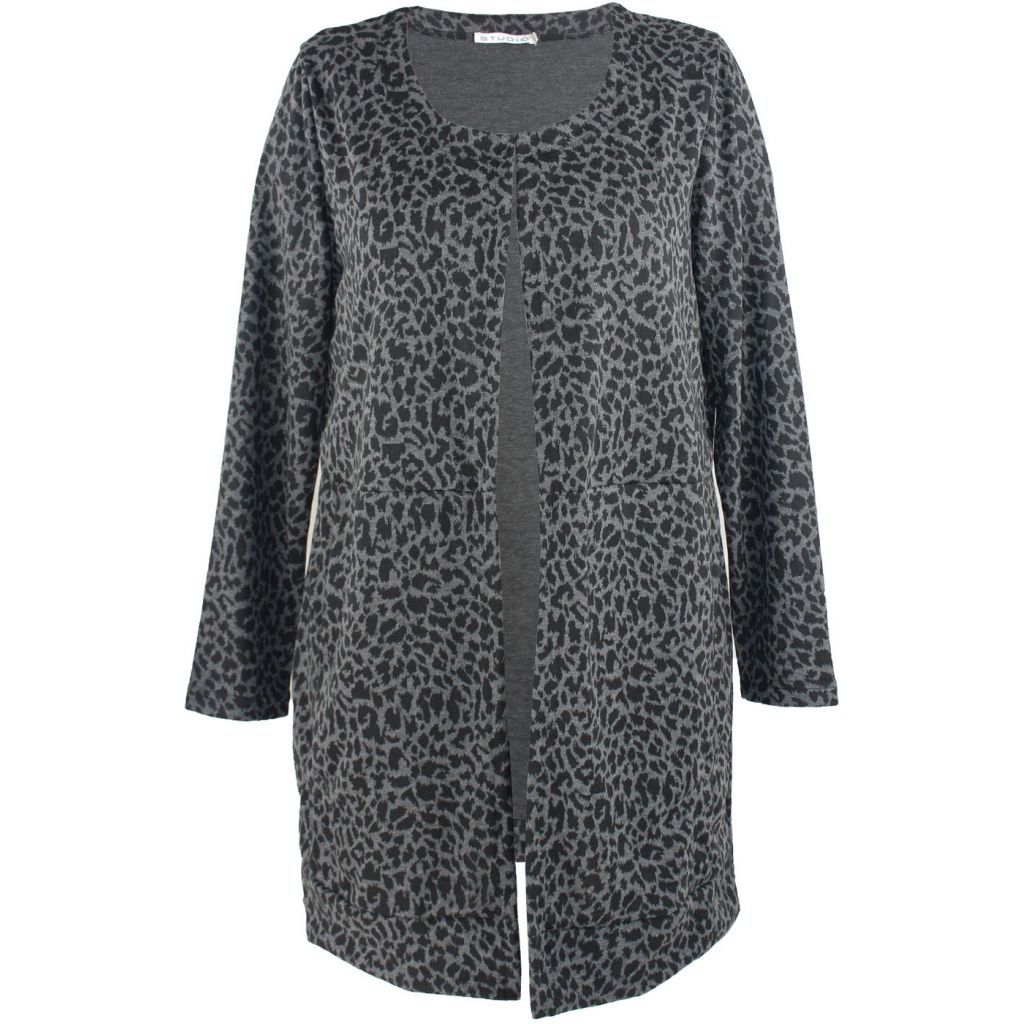 Dejlig, lang cardigan med leopardprint. Cardiganen har lange ærmer og er i et dejlig blødt materiale, der falder pænt. Cardiganen lukkes med en broche med leopard, der kan tages af, hvis du hellere vil bære cardiganen åben, eller selv har en broche, du gerne vil bruge.