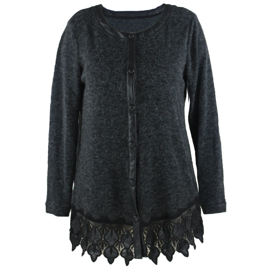 Super lækker og blød cardigan i koksgrå med 65% kaninhår. Utrolig blød og behagelig cardigan med en rund krave i imiteret læder. Det imiterede læder fortsætter ned langs knaplukningen, der lukkers med trykknapper i immiteret læder. Nederst på cardiganen er der et kækt blondebroderi med blade i samme immiterede læder. Cardiganen kan både bæres lukket eller med en smart bluse under.