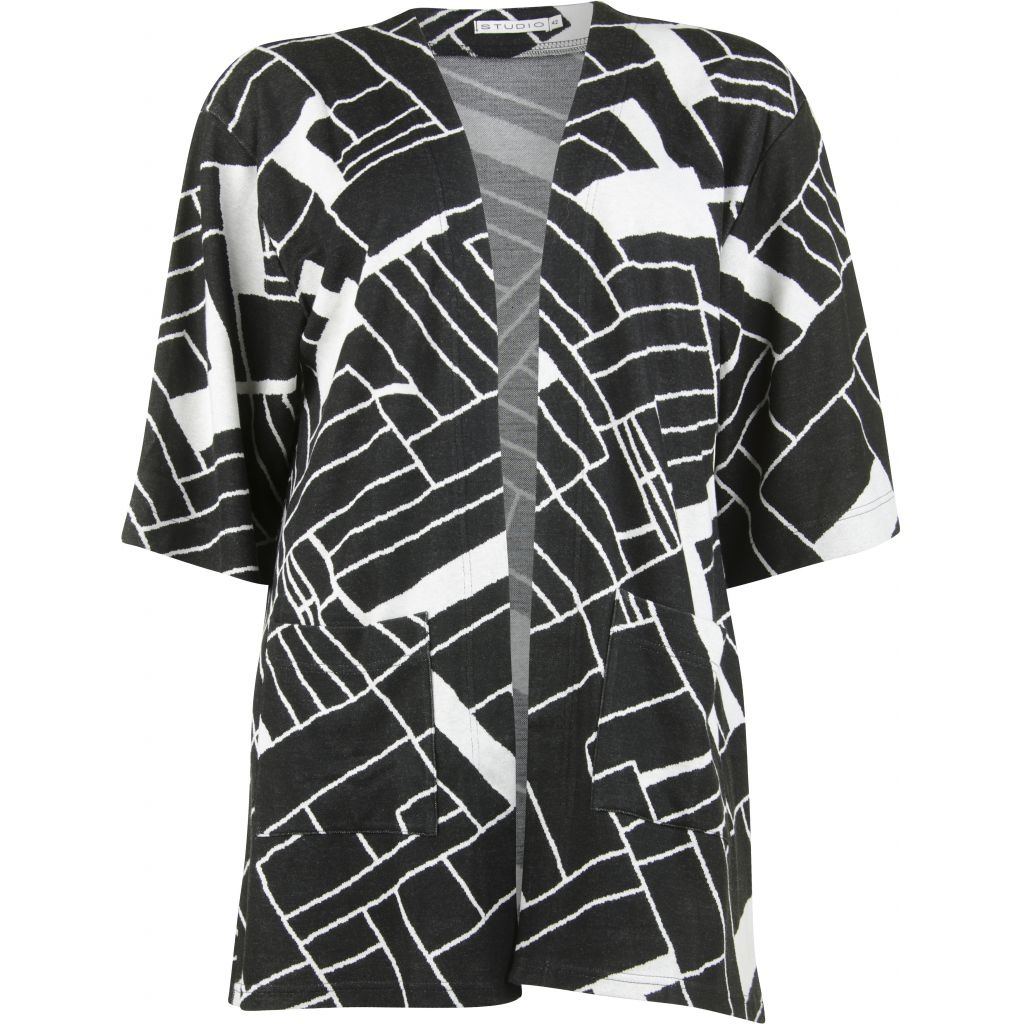 Flot kimono cardigan/jakke med korte ærmer. Jakken er sort og hvid i et smart grafisk mønster.