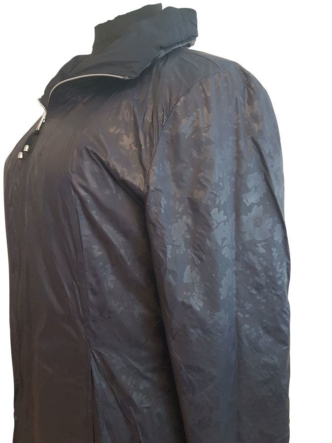 ”Indersiden” er i en frisk grafisk printet navyblå. Du vælger, føler du dig afslappet eller er du klar på narrestreger. Jakken har hætten skjult under en navy blå lynlås i kraven. Nederst har jakken et indsyet bånd, så du bestemmer hvor løst den skal sidde i bunden. Dette er praktisk, hvis man skal cykle eller er ude en dag hvor det blæser.